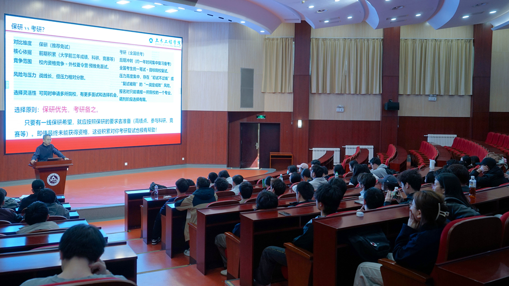 会上,冯少杰围绕学校推荐优秀应届本科毕业生免试攻读研究生的遴选推荐办法,结合学院实际,对推免名额分配、基本条件、综合评定标准及工作程序等关键内容进行了系统解读。他通过往届学生真实案例,引导同学们对照推免条件及早查缺补漏,在保持课程学业成绩的同时,积极参与学科竞赛与综合素质拓展,实现全面发展。